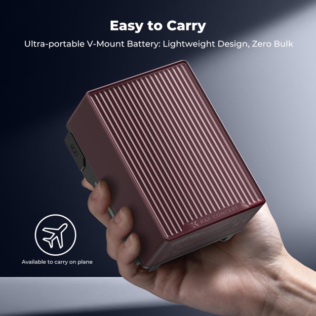 Prenosna zasnova in primerna za letalski prevoz: baterija V-mount meri 104 x 74 x 50 mm in tehta 525 g. Ohišje je trdno in odporno proti udarcem, izdelano iz ognjevarnega PC materiala, ki je odporen proti praskam in varen za uporabo. Primerna za letalski prevoz, jo lahko vzamete s seboj na letalo