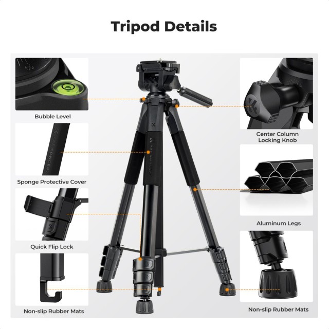 S teleskopsko palico, nastavljivo od 19″ do 68″, ta stativ omogoča širok razpon snemalnih kotov in višin. Njegova sestavljena trikotna struktura zagotavlja maksimalno stabilnost, nastavljiva palica pa omogoča gladko spreminjanje višine. Spodnji kavl omogoča obesitev dodatne teže, kar poveča stabilnost na neravnih površinah. Protizdrsne blazinice zagotavljajo trden oprijem na vsakem terenu, plošča za hitro sprostitev z 360° vodoravnim vrtenjem in naklonom +100°/-70° pa omogoča vsestransko fotografiranje iz različnih kotov. Ta stativ, ki nosi do 4 kg, je združljiv s fotoaparati, pametnimi telefoni, projektorji, spletnimi kamerami in obročnimi svetilkami, kar ga naredi vsestransko rešitev za fotografijo, videografijo, neposredno predvajanje in vloganje.