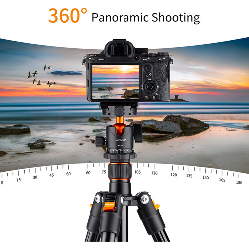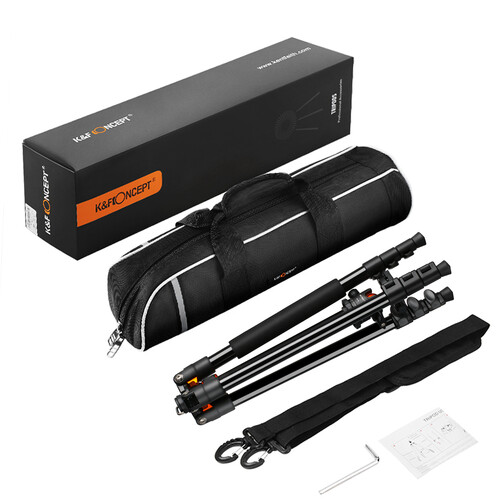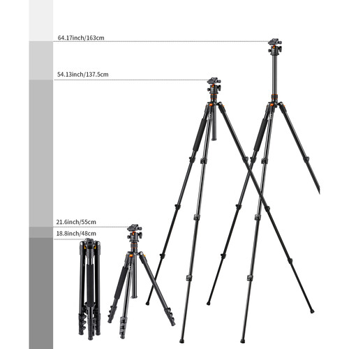 Aluminijasti stativ za fotoaparate DSLR SA234 s kroglično glavo podjetja K&F Concept je izdelan iz lahkih in togih aluminijastih nog z zaskočnico za hitro namestitev in odstranitev. Ta priročni stativ ima največjo višino 61,6" in neodvisen razpon nog, ki omogoča najmanjšo višino 16,3" za nizke perspektive in makro fotografijo. Noge so tudi obračalne za obrnjene položaje fotoaparata do nivoja tal. Ta stativ ima nosilnost 22 lb in vključuje kroglično glavo KF-28 s ploščico za hitro sproščanje, združljivo s tipom Arca.