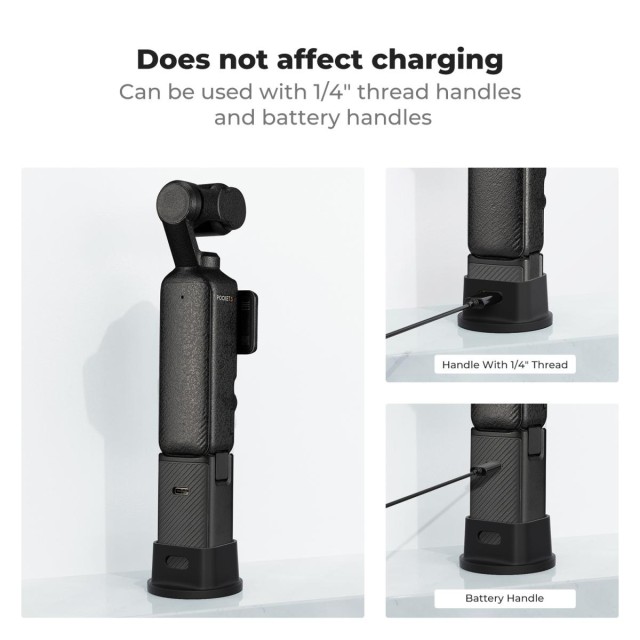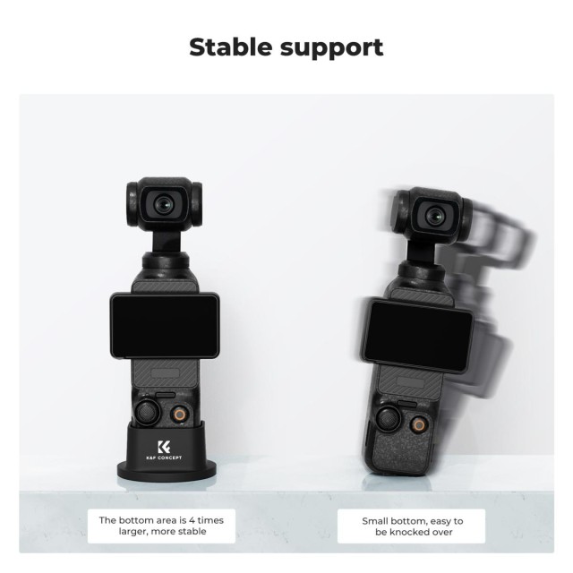 Podstavek je zasnovan za Pocket3. Velika spodnja površina omogoča stabilnejše stojišče na mizi in preprečuje padec. Popolna prileganost. Zasnovan posebej za Pocket3, omogoča namestitev na ohišje, navojni ročaj in vzdržljivi ročaj, hkrati pa podpira uporabo originalnega zaščitnega etuija.