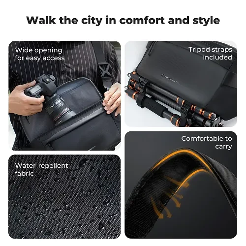Ergonomski dizajn torbe vam omogoča, da jo premaknete na sprednjo stran za hiter dostop, ne da bi jo morali snemati, protivlomni zadnji žep, poseben predal za tablico in dihanje omogočajoči oblazinjeni pas pa jo naredijo idealno za celodnevno uporabo. Ta vsestranska torba s prostornino 10 litrov je idealna spremljevalka za fotografe in videografe, ki želijo lahkotno rešitev za prenašanje z hitrim dostopom, ki ščiti njihovo opremo in ima nujne stvari vedno pri roki.