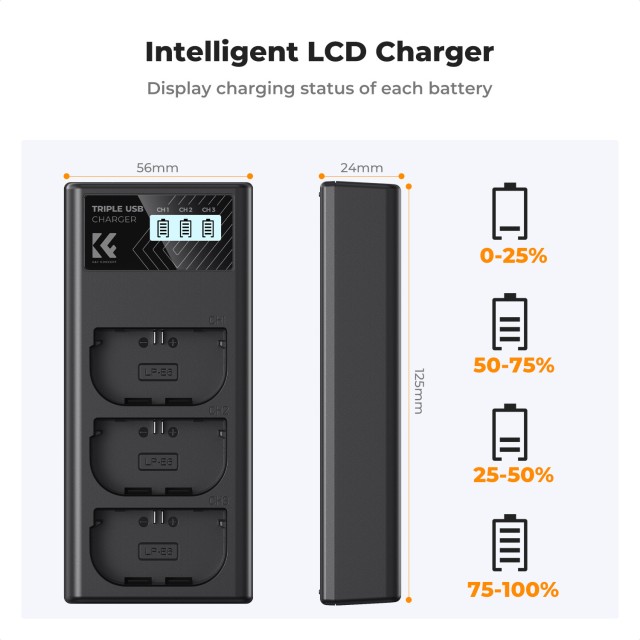K&F Concept Sony NP-FZ100 3-Pack polnilec za fotoaparate z LCD zaslonom je vrhunska rešitev za polnjenje za fotografe, ki zahtevajo zanesljivost in udobje. Ta kompaktni polnilnik, ki je zasnovan za polnjenje do treh baterij Sony NP-FZ100 hkrati, je popoln tako za uporabo v studiu kot na potovanjih.