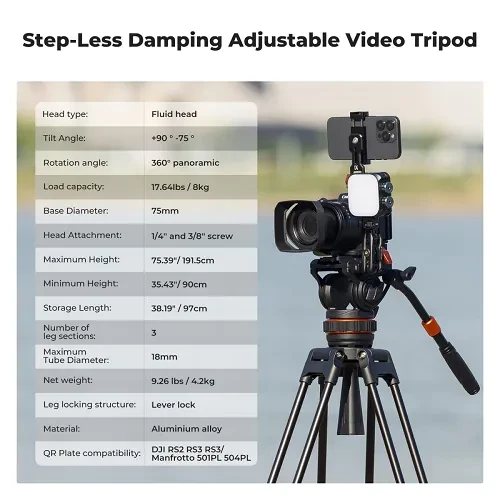 Njegove 3-delne nastavljive noge in srednji razširjevalnik zagotavljajo večjo stabilnost na neravnem terenu, medtem ko mehanizem flip-lock omogoča hitro nastavitev višine. Podpira obremenitve do 8 kg in je združljiv z DSLR-ji, brezzrcalnimi fotoaparati, kamkorderji in celo kinematografskimi opremami. Srce tega sistema je fluidna glava BV10 z neskončno nastavljivim hidravličnim blaženjem. To omogoča neverjetno gladke in dosledne premike kamere, ne glede na to, ali izvajate nadzorovane panoramske posnetke (360° vodoravni zasuk) ali natančne nagibe (+90°/-75° navpična nastavitev). Dosegajte profesionalne, gladke posnetke, ki bodo vaše videoposnetke resnično izpostavili.