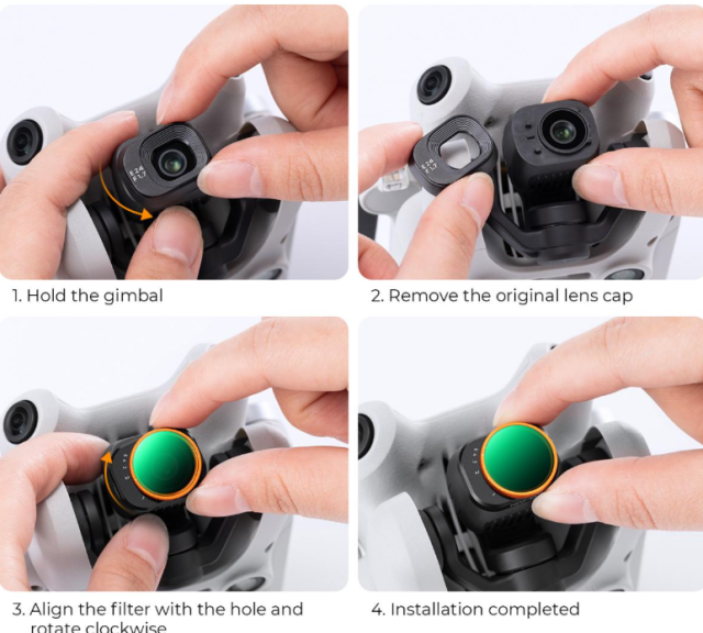 Izdelan je iz vrhunskega optičnega stekla AGC in ojačan z 28 sloji naprednega nano premaza na obeh straneh, ki odbija vodo, olje, prah in praske ter ohranja neoporečno kakovost slike tudi v zahtevnih okoljih, kot so obalni vetrovi ali prašni vzleti. Ultra lahka okvir, ki tehta le 2 g (0,07 oz), je bil podvržen strogim testom, da ne moti kalibracije gimbala, ravnotežja ali delovanja drona, kar omogoča nemoteno in stabilno letenje. Natančno izdelana zadnja sponka se popolnoma prilega podlagi objektiva Mini 4 Pro, kar omogoča takojšnjo namestitev in trdno pritrditev med hitrimi manevri ali v turbulentnih razmerah.