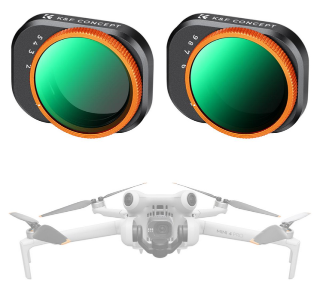 S kompletom filtrov K&F Concept Variable ND Lens Filter Kit dvignite svoje fotografiranje z DJI Mini 4 Pro na višjo raven. Ta paket vsebuje dva vsestranska filtra: ND2-32, ki omogoča zmanjšanje svetlobe za 1-5 stopinj, in ND32-512, ki omogoča zmanjšanje svetlobe za 5-9 stopinj. Ta filtra vam omogočata natančno prilagajanje osvetlitve različnim svetlobnim razmeram, zato sta idealna tako za fotografiranje iz zraka pri močni kot pri šibki svetlobi.