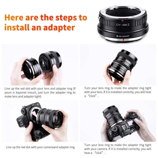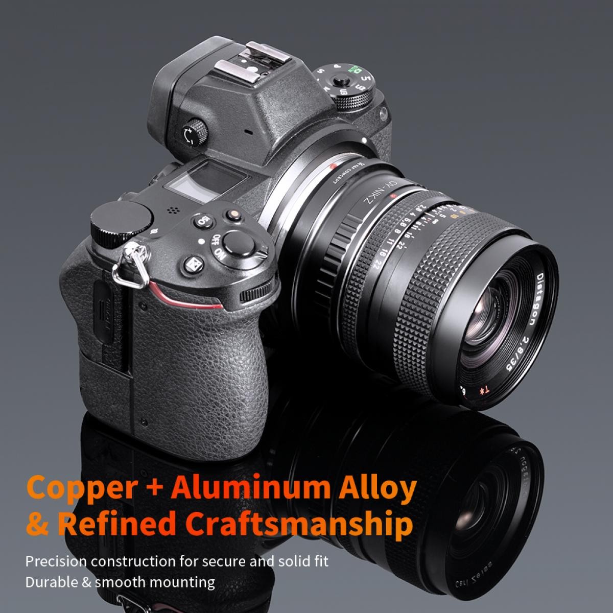 K&F Concept Contax Yashica do Nikon Z objektivni adapter omogoča uporabo objektivov Contax/Yashica (C/Y) na brezzrcalnih fotoaparatih Nikon Z, kot sta Z6 in Z7. Izdelan je z gladkim bakrenim vmesnikom za enostavno namestitev, podpira popolnoma ročno upravljanje z neskončnim ostrenjem in vključuje jasne oznake za enostavno namestitev.