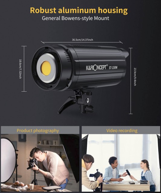 Svetilka je izdelana iz trpežnega ohišja iz aluminijeve zlitine in ima učinkovit sistem odvajanja toplote s premium hladilnikom in ultra tihim hladilnim ventilatorjem, ki zagotavlja dolgoročno stabilnost brez motenja avdio snemanja. Priljubljen Bowensov nosilec zagotavlja široko združljivost s softboxi in modifikatorji, priloženi reflektor in reža za dežnik pa omogočata prilagodljivo oblikovanje svetlobe. Z robustno konstrukcijo, možnostjo daljinskega upravljanja in univerzalnim nosilcem je K&F ST-150W zanesljivo orodje za osvetljevanje tako v studiu kot na terenu.