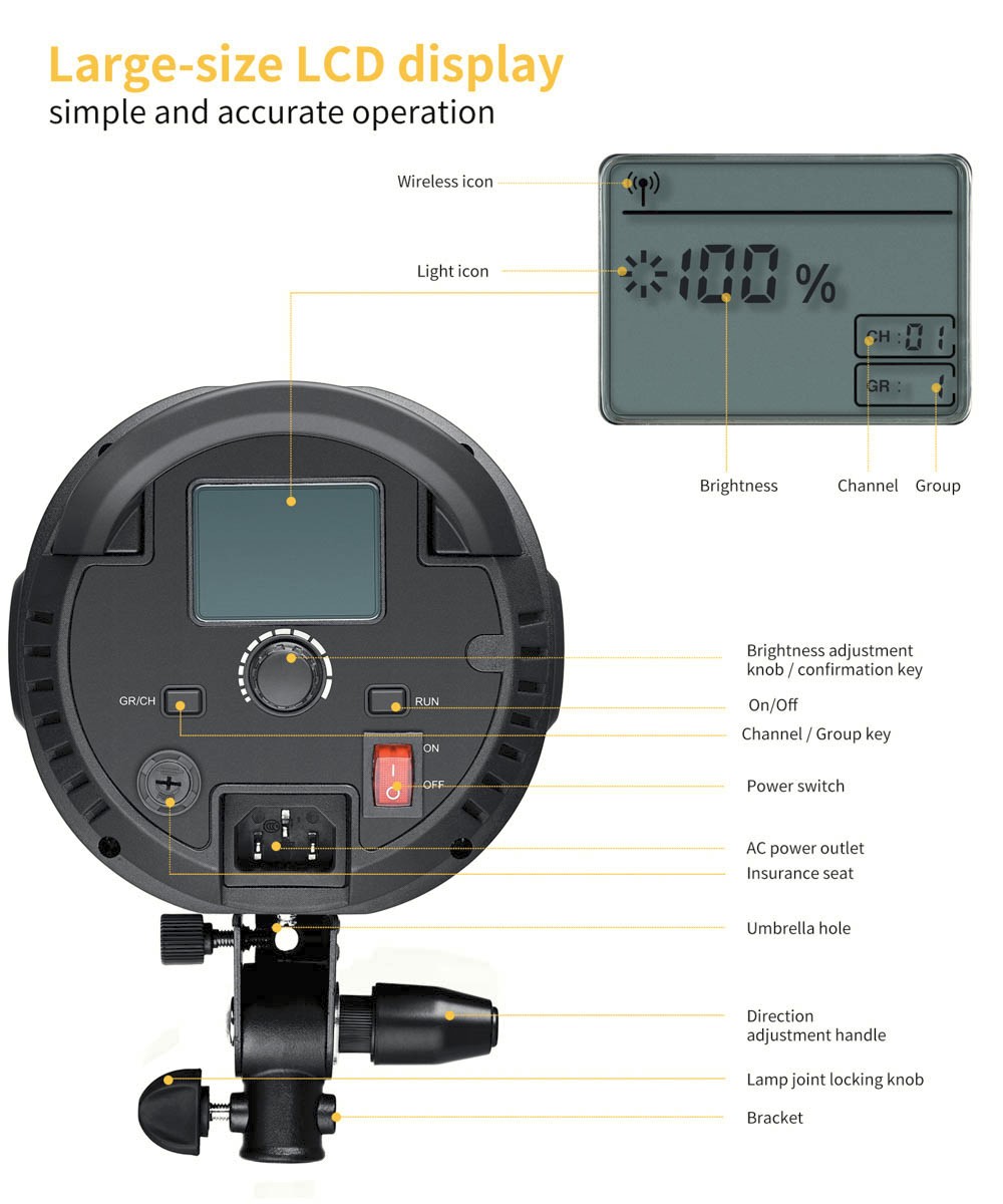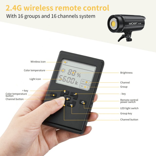 S CRI 95 in TLCI 95+ ST-150W zagotavlja naravne barve kože in natančno reprodukcijo barv. Svetlost se lahko gladko nastavlja od 10 % do 100 % z zadnjim dimmerjem ali priloženim brezžičnim daljinskim upravljalnikom. Velik, jasen LCD-zaslon prikazuje odstotek svetlosti, kanal in nastavitve skupine, kar omogoča združevanje in hkratno upravljanje več svetilk.