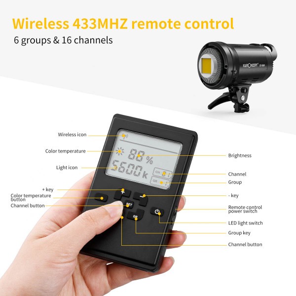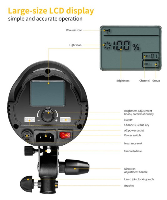 Svetlost se lahko gladko nastavlja od 10 % do 100 % z vgrajenim dimmerjem ali priloženim brezžičnim daljinskim upravljalnikom. Jasen zadnji LCD-zaslon prikazuje odstotek svetlosti, kanal in informacije o skupini, kar omogoča združevanje in hkratno upravljanje več svetilk. Oblika Bowensovega nosilca podpira široko paleto softboxov in modifikatorjev, priloženi reflektor in reža za dežnik pa omogočata prilagodljive možnosti oblikovanja svetlobe.