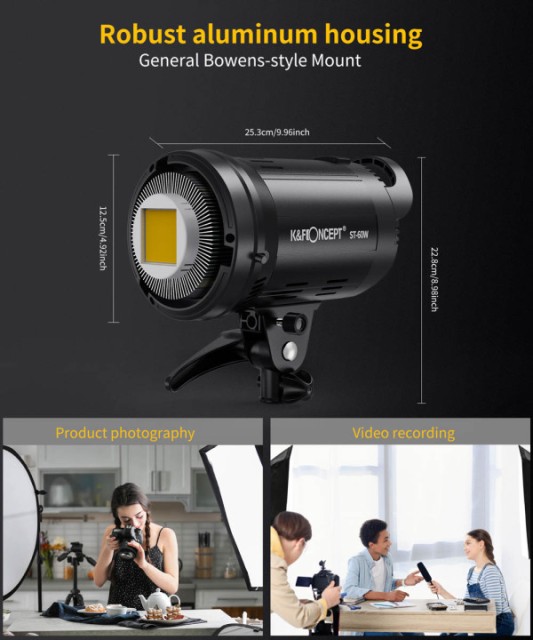K&F ST-60W Mono LED Video and Photography Light je majhna, a zmogljiva rešitev za neprekinjeno osvetljevanje, izdelana z napredno COB LED tehnologijo. S fiksno barvno temperaturo dnevne svetlobe 5600K in visokim CRI 95 zagotavlja naravne odtenke kože in dosledno barvno natančnost tako za videoposnetke kot za fotografije. ST-60W proizvaja do 5100 lumnov na 1 meter in je idealna za ustvarjalce vsebin, vlogerje, intervjuje in majhna studijska okolja.