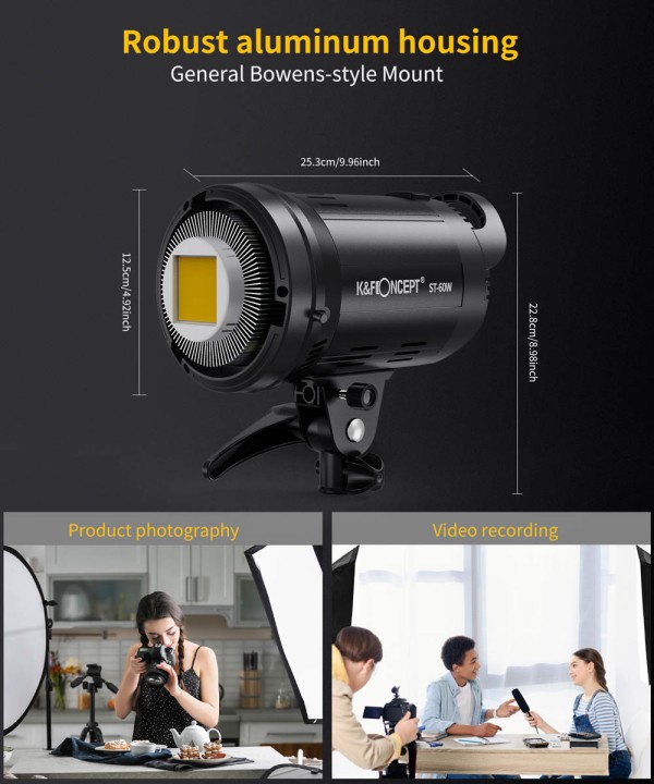 ST-60W je vgrajen v trpežno ohišje iz aluminijeve zlitine in ima učinkovit sistem odvajanja toplote s tiho hladilno lopatico, zaradi česar je primeren za okolja, občutljiva na zvok. Zaradi kompaktne velikosti, lahke konstrukcije in zanesljive zmogljivosti je odlična izbira za ustvarjalce, ki potrebujejo profesionalno osvetlitev na poti.
