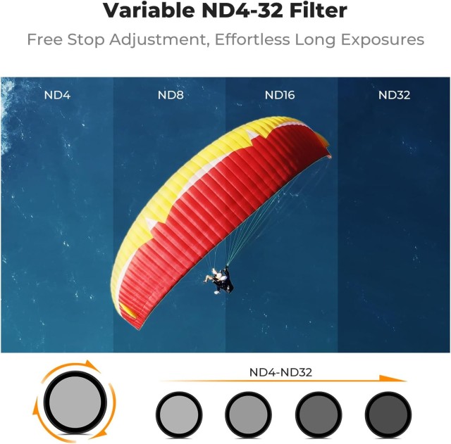 Ta nastavljiv ND filter omogoča brezstopenjsko zmanjšanje svetlobe od ND4 do ND32 (2 do 5 stopenj), kar vam omogoča natančno nastavitev osvetlitve v realnem času brez menjave filtrov. Je idealen za snemanje v jasni dnevni svetlobi, saj vam pomaga upočasniti hitrost zaklopa, da dosežete naravno zamegljenost gibanja in gladke kinematografske posnetke. Filter je izdelan iz optičnega stekla visoke ločljivosti, ki zagotavlja odlično jasnost, natančne barve in minimalno popačenje.