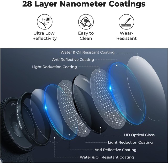 Napredna 28-slojna nano tehnologija premaza zmanjšuje odsevanje in bleščanje, hkrati pa dodaja hidrofobno, odporno proti praskam in madežem zaščito. Zaradi tega je filter zanesljiv za zunanje avanture, akcijski šport, potovanja in snemanje v slogu vlogov, kjer se svetlobne razmere hitro spreminjajo.