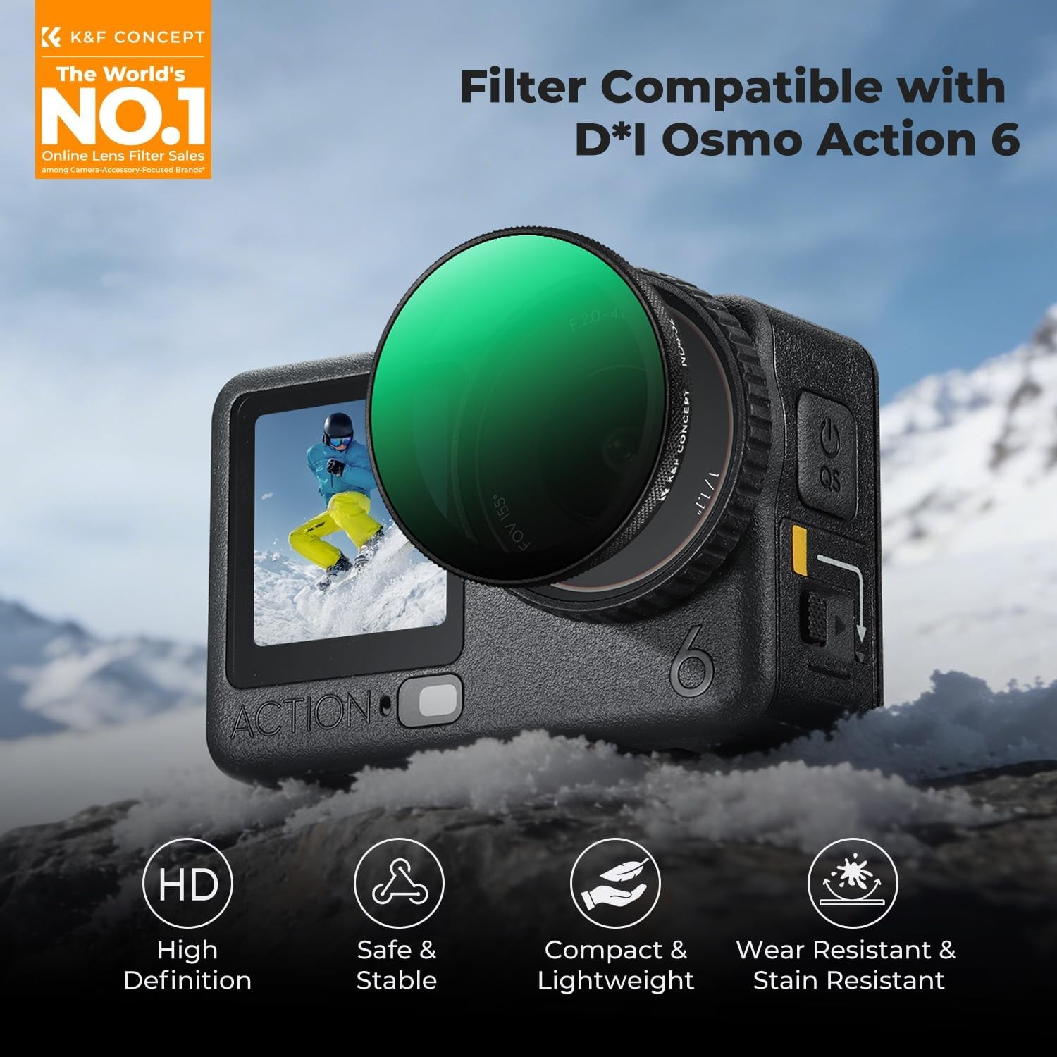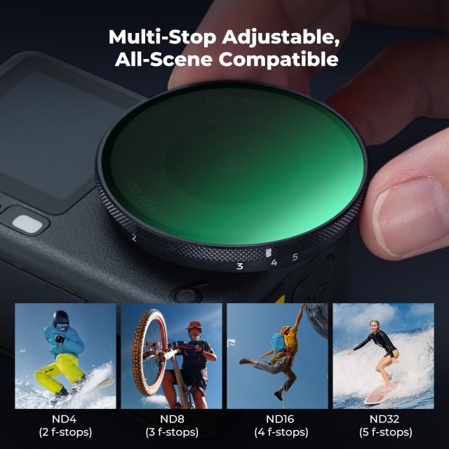 Filter K&F Concept Variable ND4–ND32 je posebej zasnovan za akcijo kamero DJI Osmo Action 6, saj ponuja brezhibno združljivost in hitro namestitev brez orodja. Zasnovan je tako, da se namesti enako kot originalni filter OEM, ima varno protizdrsno strukturo, ki ostane trdno na mestu med intenzivnim gibanjem, hkrati pa ostaja združljiv z večino ohišij in dodatkov.
