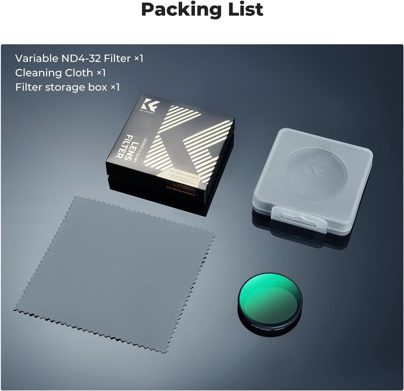 K&F Concept nastavljiv filter ND4–ND32 za DJI Osmo Action 6 je visokoločljiv filter z nastavljivo nevtralno gostoto, zasnovan za natančen nadzor nad osvetlitvijo v spreminjajočih se svetlobnih pogojih. Hitra namestitev s pritrditvijo in vrhunsko optično steklo omogočata gladko, kinematografsko zameglitev gibanja, hkrati pa ohranjata ostro kakovost slike med snemanjem akcijskih prizorov.
