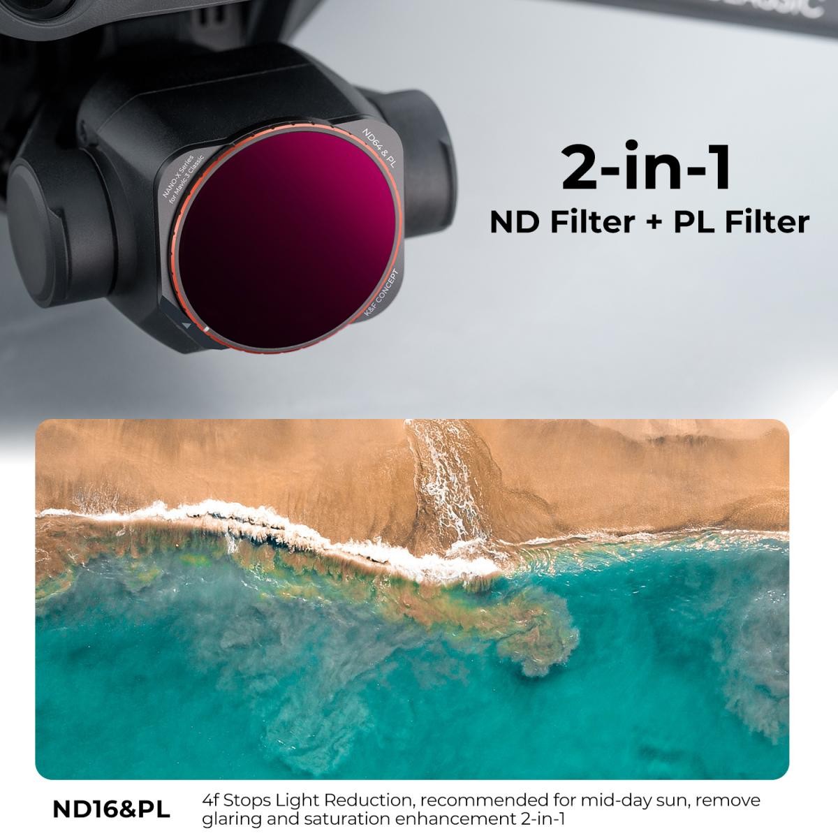 Filter K&F Concept ND16 & PL, zasnovan posebej za DJI Mavic 3 Classic, združuje dva bistvena učinka v enem filtru. Funkcija ND16 zmanjša vpadajočo svetlobo za 4 stopnje, kar je idealno za snemanje v svetlih dnevnih pogojih in omogoča boljši nadzor nad hitrostjo zaklopa in osvetlitvijo. Vgrajeni CPL (polarizator) pomaga zmanjšati odsevanje in bleščanje z nekovinskih površin, kot sta voda in steklo, hkrati pa izboljša barvno nasičenost in kontrast za bolj živahne posnetke iz zraka.