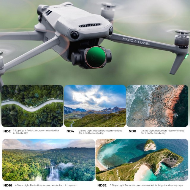 Filter je izdelan iz visokokakovostnega optičnega stekla AGC in zagotavlja realistično reprodukcijo barv in ostro kakovost slike. Njegov 28-slojni nano premaz zmanjšuje odboje, bleščanje in duhove, hkrati pa ponuja tudi vodotesne, protiprasne in protivlečne lastnosti. Okvir v bajonetnem slogu zagotavlja varno in natančno prileganje objektivu Mavic 3 Classic gimbal, medtem ko ultralahka zasnova (3,2 g) ne vpliva na delovanje gimbala. Počrnjena površina filtra zmanjšuje odboje in zagotavlja čiste, profesionalne slike tudi v močni svetlobi.