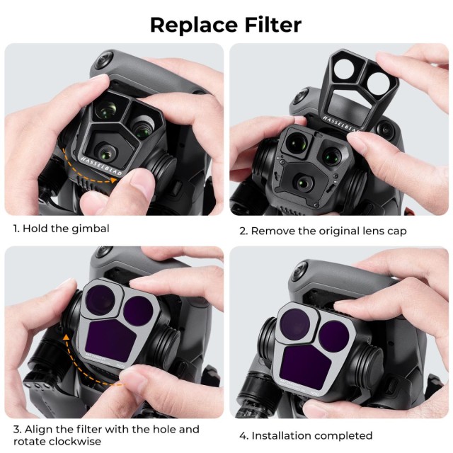 DJI Mavic 3 Pro Komplet filtrov ND】 komplet 4 filtrov ND8, ND16, ND32, ND64, posebej zasnovan za DJI Mavic 3 Pro.【HD AGC steklo】Narejen iz uvoženega optičnega stekla AGC z večplastno prevleko, ki zmanjšuje bleščanje in odboj objektiva ter zagotavlja povrnitev pravih barv slike.