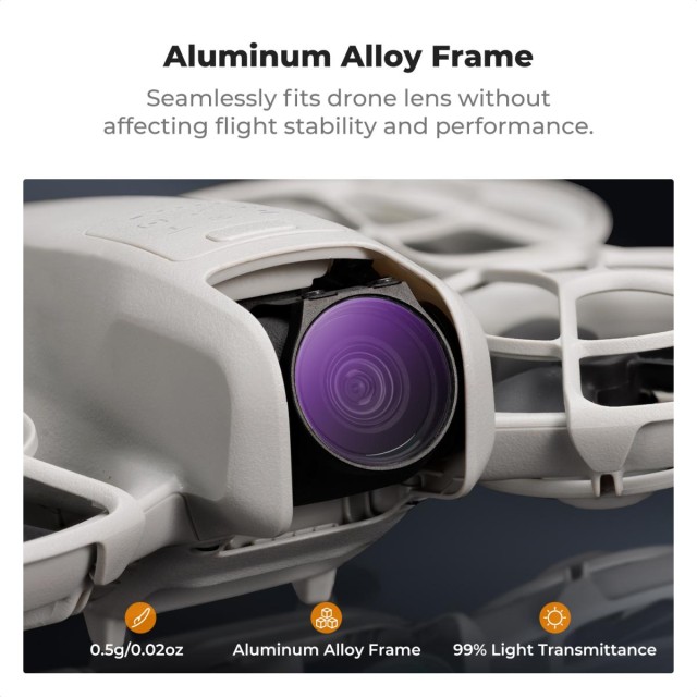Komplet filtrov K&F Concept DJI NEO 4pcs ND&PL izboljša fotografiranje iz zraka z združevanjem funkcij ND in CPL v enem filtru. S filtri ND8&PL, ND16&PL, ND32&PL in ND64&PL zagotavlja zmanjšanje svetlobe za 3-6 stopenj, nadzoruje odseve ter povečuje kontrast in nasičenost. Ti filtri so izdelani iz optičnega stekla AGC, 28-slojnih prevlek in lahke konstrukcije, varne za gimbal, zato zagotavljajo vrhunsko jasnost slike, ne da bi vplivali na stabilnost drona.