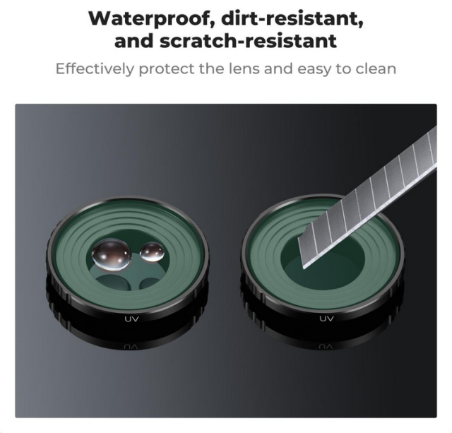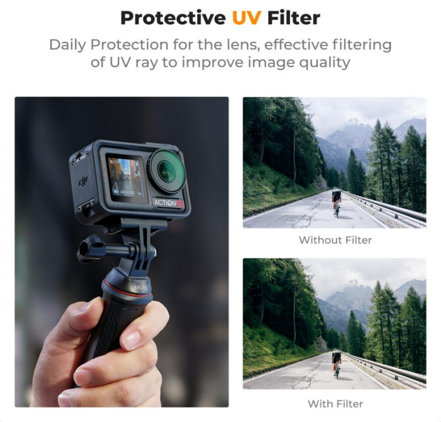- Zaščita objektiva s preprečevanjem UV-žarkov: Ta filter učinkovito blokira UV-žarke in tako zmanjša njihov vpliv na jasnost slike, hkrati pa ščiti objektiv vaše akcijske kamere pred praskami, prahom in vodo.