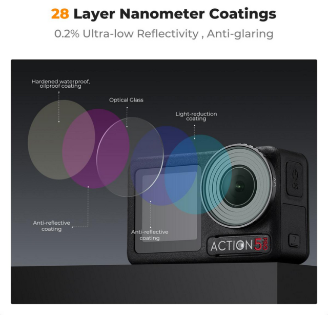 - Lahka in stabilna zasnova: Filter je bil zasnovan za minimalno težo in je bil podvržen strogemu testiranju, da bi ohranil stabilnost in zmogljivost vaše akcijske kamere, kar vam omogoča, da brez težav posnamete jasne in ostre posnetke.