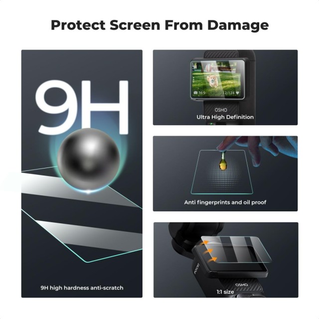 Zaščita zaslona kamere 6 kosov, združljiva z DJI Osmo Pocket 3, 0,3 mm 9H trdota kaljeno steklo*3 + zaščita objektiva*3 + krpica za vakuumsko čiščenje*1.Ti kompleti folij so posebej zasnovani za kamero DJI Osmo Pocket 3, vključno s 3x zaščito zaslona + 3x pokrovom za vročo nogavico, kar zagotavlja natančno namestitev brez mehurčkov.