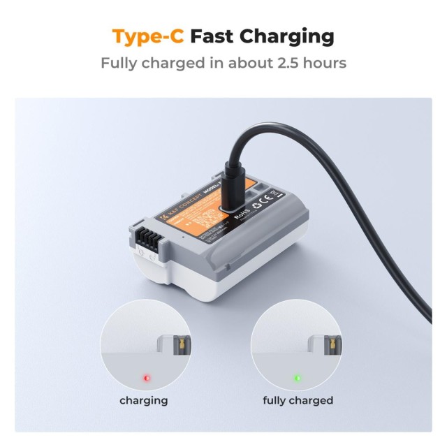 K&F Concept EN-EL15C baterija z zmogljivostjo 2600 mAh in hitrim polnjenjem tipa C za fotoaparate Nikon Z8, Z7II, Z 7, Z 6II, Z 6, Z5, D850, D810, D810A, D780, D750, D610, D500, D7500, D7200. S povezavo priloženega polnilnega kabla z baterijo EN-EL15C lahko v približno 2,5 uri dobite popolnoma napolnjeno baterijo. Indikator polnjenja jasno prikazuje stanje. Rdeča barva pomeni polnjenje, zelena pa popolno polnjenje.