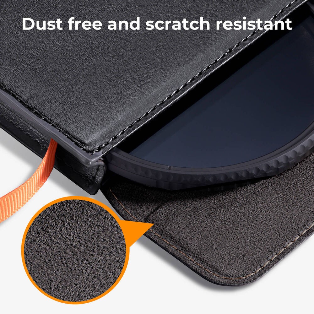 Zaradi tanke in lahke zasnove ga lahko brez težav shranite v torbo za fotoaparat, nahrbtnik ali žep, ne da bi zavzemal veliko prostora. Zaščitna notranjost preprečuje obrabo površine in tako zagotavlja, da vaš filter ohrani optimalno optično kakovost. Ne glede na to, ali shranjujete UV, CPL, ND ali filtre za posebne učinke, ta etui ponuja preprosto in učinkovito rešitev za vsakodnevno zaščito in organizacijo.