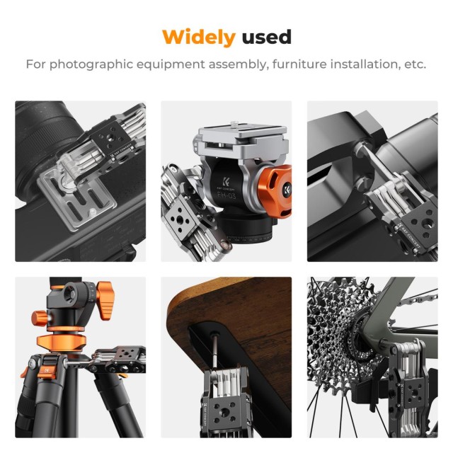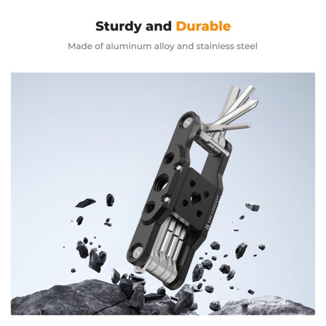 10-v-1 večnamensko orodje: Žepno orodje vključuje 6 ključev za šestkotne vijake (2,0, 2,5, 3, 4, 5, 3/16") in 4 izvijače (T25 Torx, Phillips, SL7 in ploščati). Opremljen je z dodatnimi navojnimi luknjami za rezervne vijake (3/8" × 2, 1/4" × 5). Prenosni komplet izvijačev iz aluminijeve zlitine in nerjavečega jekla za dolgo življenjsko dobo. Izvijači in ključi so izdelani iz visokotrdnega jekla, ki zagotavlja odlično trajnost in odpornost proti zlomu.