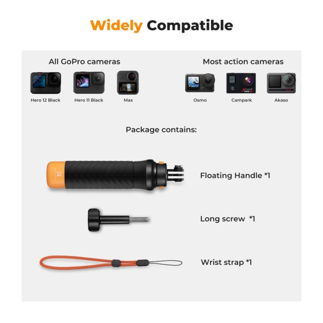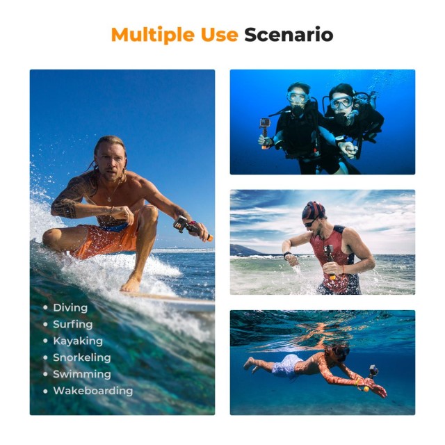 Zasnova s hitrim sproščanjem: snemljiva glavna enota omogoča enostavno odstranitev fotoaparata za predvajanje, ne da bi se bilo treba ukvarjati z zapletenim vijačenjem ali sestavljanjem. Visoka plovnost: plovnost plavajočega ročnega držala zagotavlja, da fotoaparat ostane na površju, zato se lahko sprostite in osredotočite na zajemanje čudovitih posnetkov, ne da bi vas skrbelo, da boste izgubili opremo.
