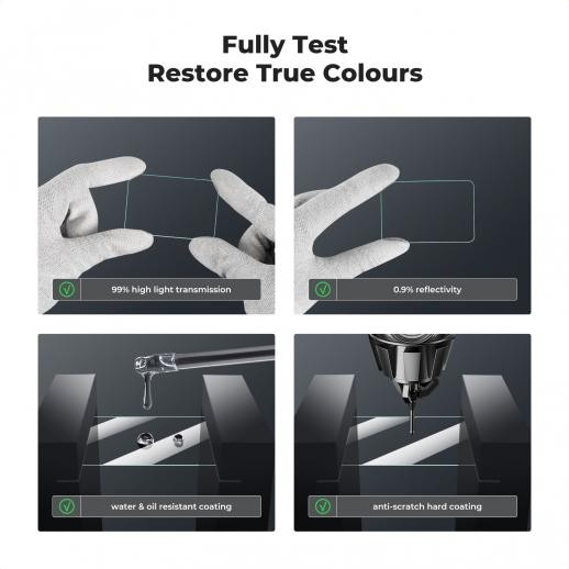 - * 【Visoka prepustnost】99,99 % čistost visoke ločljivosti, ki zagotavlja popolno jasnost in barve slike. Deluje kot zaščita pred prahom in praskami, ščiti pred potnimi in oljnimi ostanki prstnih odtisov ter izboljšuje vidljivost zaslona.