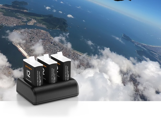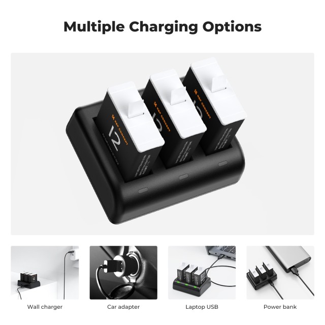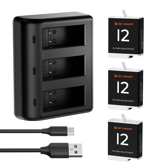 K&F Concept Hero 12 Battery 3-Pack 1730mAh Enduro baterije s polnilnikom s tremi režami Združljive s kamerami GoPro Hero 12, GoPro Hero 11, GoPro Hero 10, GoPro Hero 9 Black. Originalni standard. 3-pack 1730mAh enduro baterije uporabljajo visokokakovostne baterijske celice, uporabljajo originalni standard, nazivna napetost 3,85 V, 1730 mAh, dejanska zmogljivost, brez učinka spomina baterije.