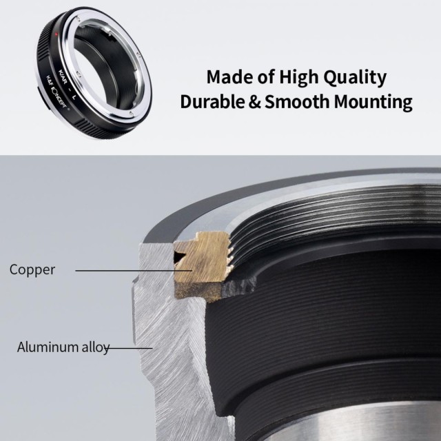 Visoko precizni adapter za objektive K&F K/AR-L omogoča uporabo objektivov Konica AR na fotoaparatih Leica L-mount. Izdelan je iz bakra in aluminijeve zlitine, omogoča gladko namestitev, ročno nastavitev zaslonke prek vgrajenega obroča za zaslonko in podporo za neskončno ostrenje.