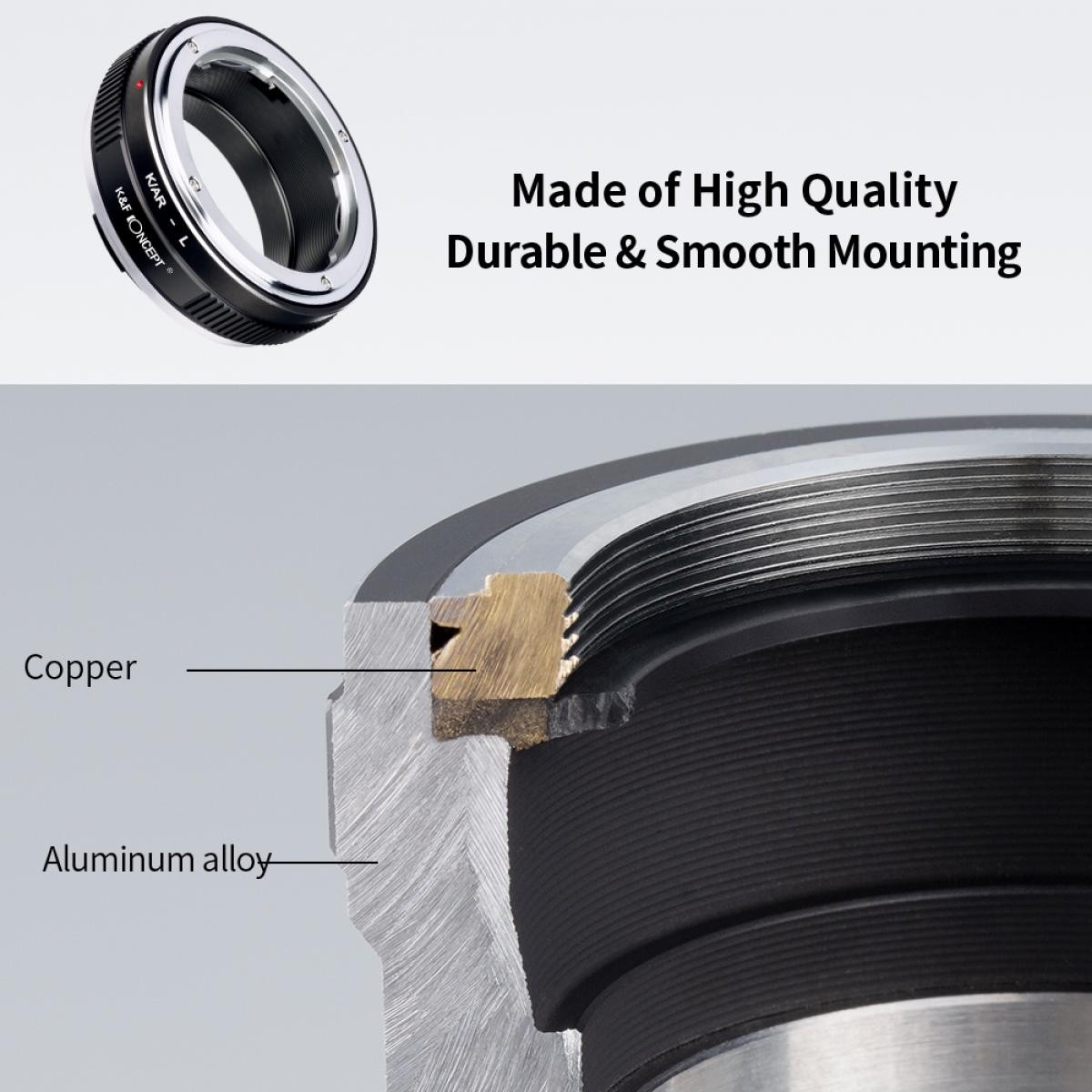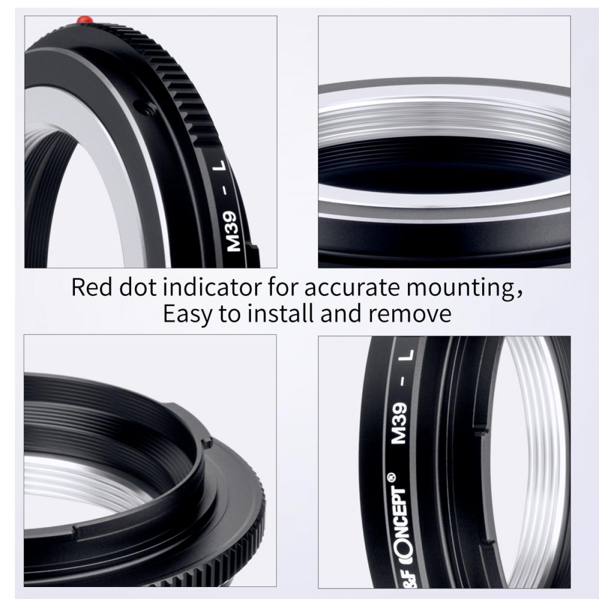 Visoko precizni adapter za objektiv K&F M39 na L-mount omogoča uporabo objektivov Leica M39 na brezzrcalnih fotoaparatih L-mount. Izdelan je iz visokokakovostne bakrene in aluminijeve zlitine, nudi natančno poravnavo, gladko montažo, popoln ročni nadzor in nastavljiv obroč za zaslonko.