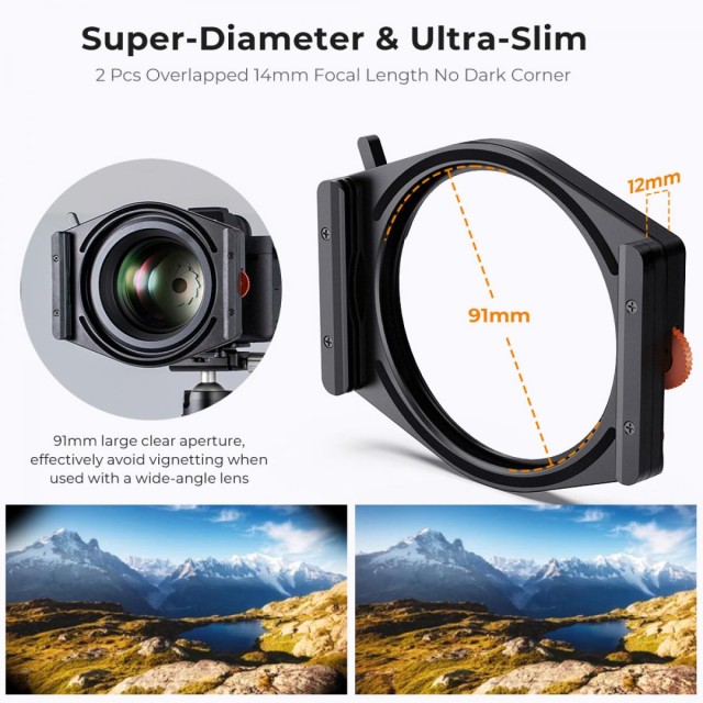 Edinstven kvadratni okvir filtra s 95MM CPL, debelina držala 12 mm, enostaven za uporabo, brez uhajanja svetlobe. Učinkovito zmanjša možnost vinjetiranja pri uporabi ultra širokokotnega objektiva. Izjemno tanek okvir in velik premer zagotavljata, da pri širokokotnem objektivu ni vinjetiranja, zadnja zasnova CPL pa omogoča priročno namestitev in odstranitev.