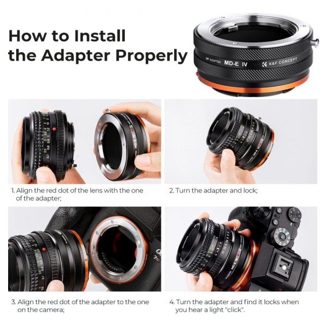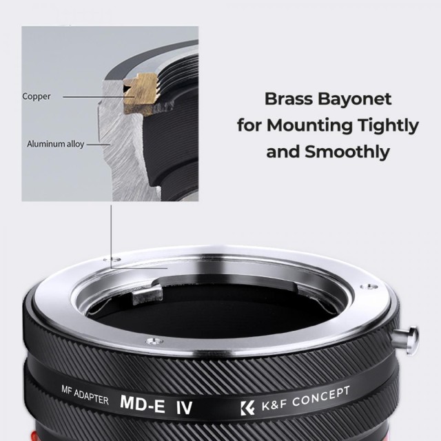 • Visoko tolerančna natančna izdelava, s tem adapterjem za objektiv lahko objektiv in fotoaparat tesno in gladko združite z bajonetom, da dosežete nastavljivost in ostrenje ter oživite objektive Minolta MD/MC z vijakom na fotoaparatih Sony E