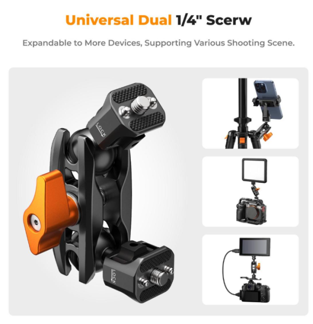 Zasnova z dvojno kroglasto glavo omogoča polno 360° vrtenje in pozicioniranje pod različnimi koti, kar vam daje popolno svobodo pri prilagajanju opreme točno po potrebi – ne glede na to, ali natančno prilagajate kadriranje ali hitro premeščate dodatke. Gumijasta obloga na pritrdilnih točkah zagotavlja nadzorovano trenje za gladko in stabilno prilagajanje, hkrati pa ščiti vašo opremo pred praskami.