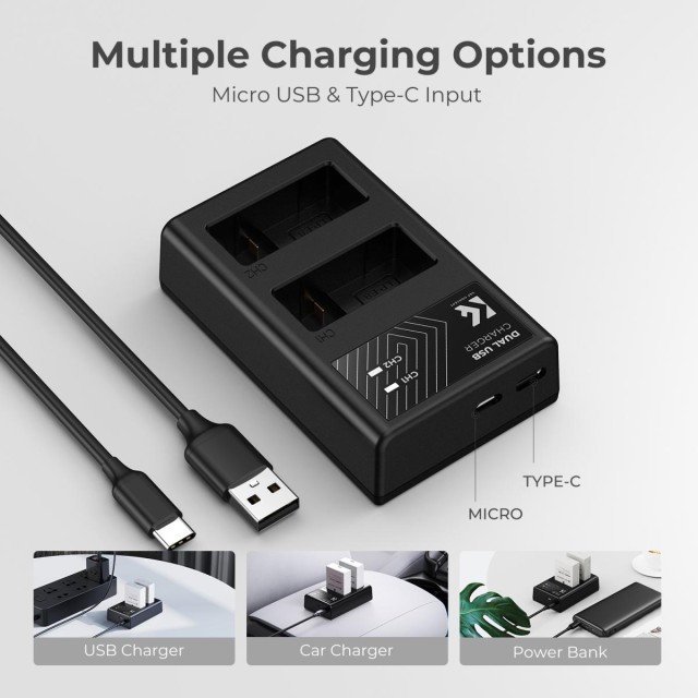 Dve nadomestni bateriji LP-E8 s kapaciteto 1200 mAh in polnilec z dvema režama zagotavljata več energije za fotografiranje s fotoaparatom. Popolno dekodiranje, združljivo s fotoaparati, ki uporabljajo baterije modela LP-E8, podpira originalne polnilnike, kot so Canon EOS 700D 650D 550D X7i X6i X5 in drugi fotoaparati. Polnilec ima dva vhodna vmesnika, Micro USB/Type C, in podpira različne možnosti polnjenja: polnite ga lahko prek mobilnega napajalnika, mobilnega napajalnika/baterije, polnilnika USB in avtomobilskega polnilnika; zagotavlja vam različne možnosti polnjenja Možnost kot standardni polnilec.