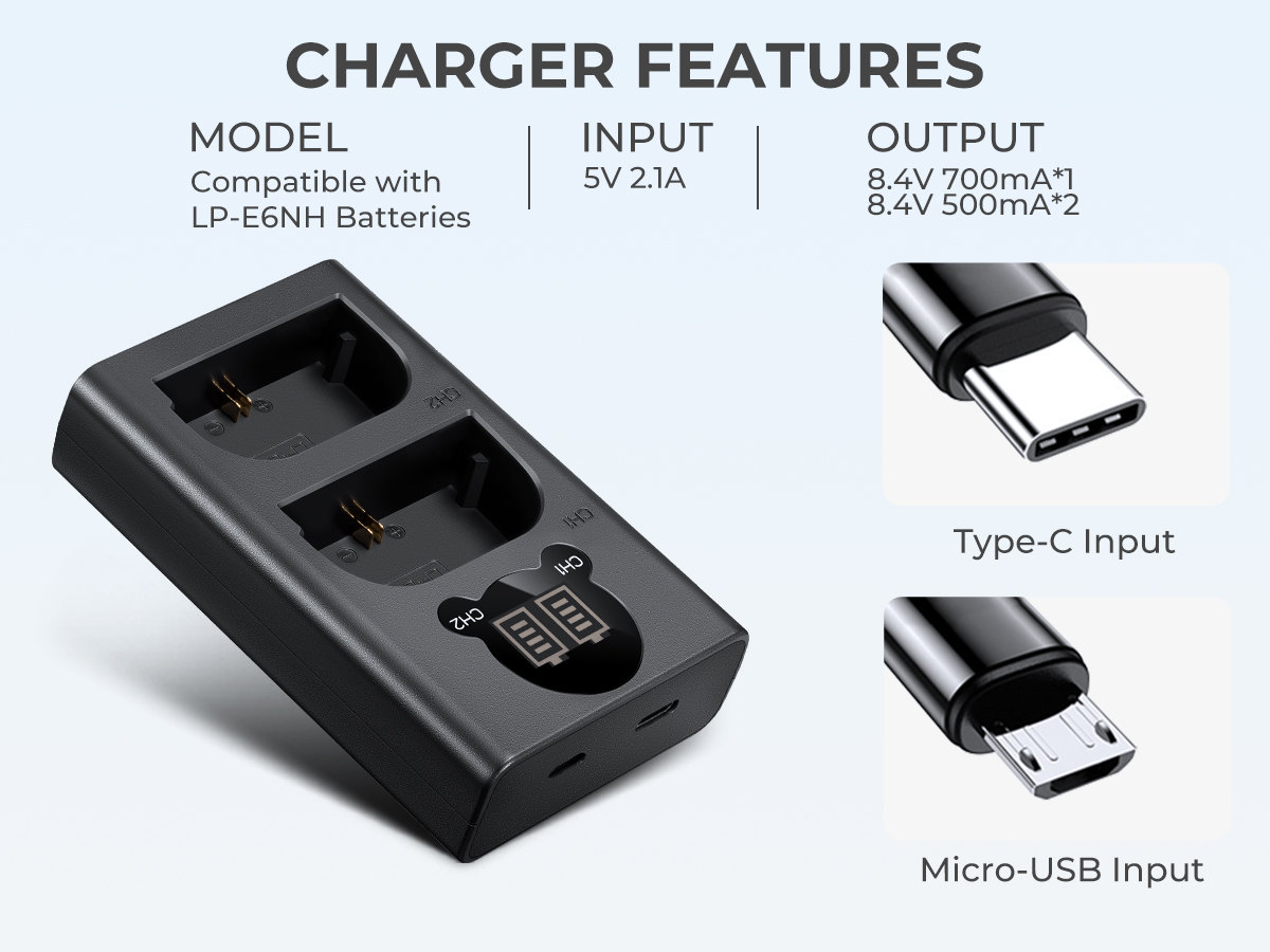 * 【Inteligentno polnjenje】 Dvojni polnilnik LCD natančno prikazuje stanje polnjenja baterije, postopek polnjenja uporablja inteligentni čip za boljšo zaščito baterije; polnilna vrata z dvema režama lahko hitro polnijo dve bateriji hkrati, kar močno prihrani vaš čas, je najboljša izbira za potovanja.