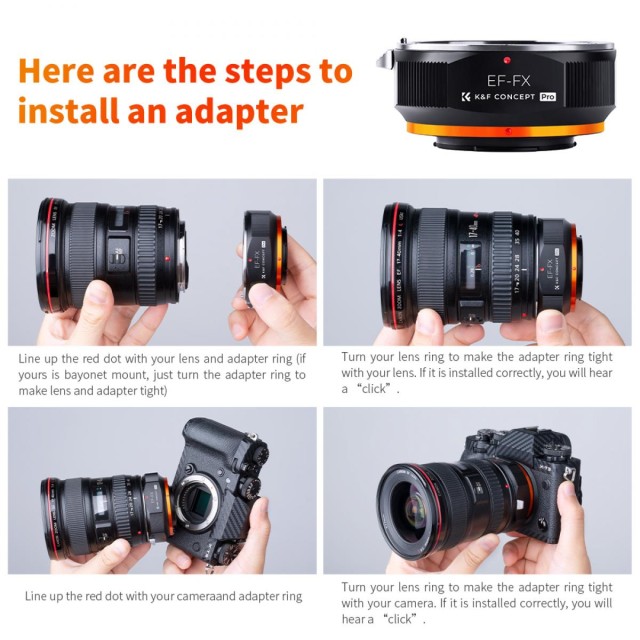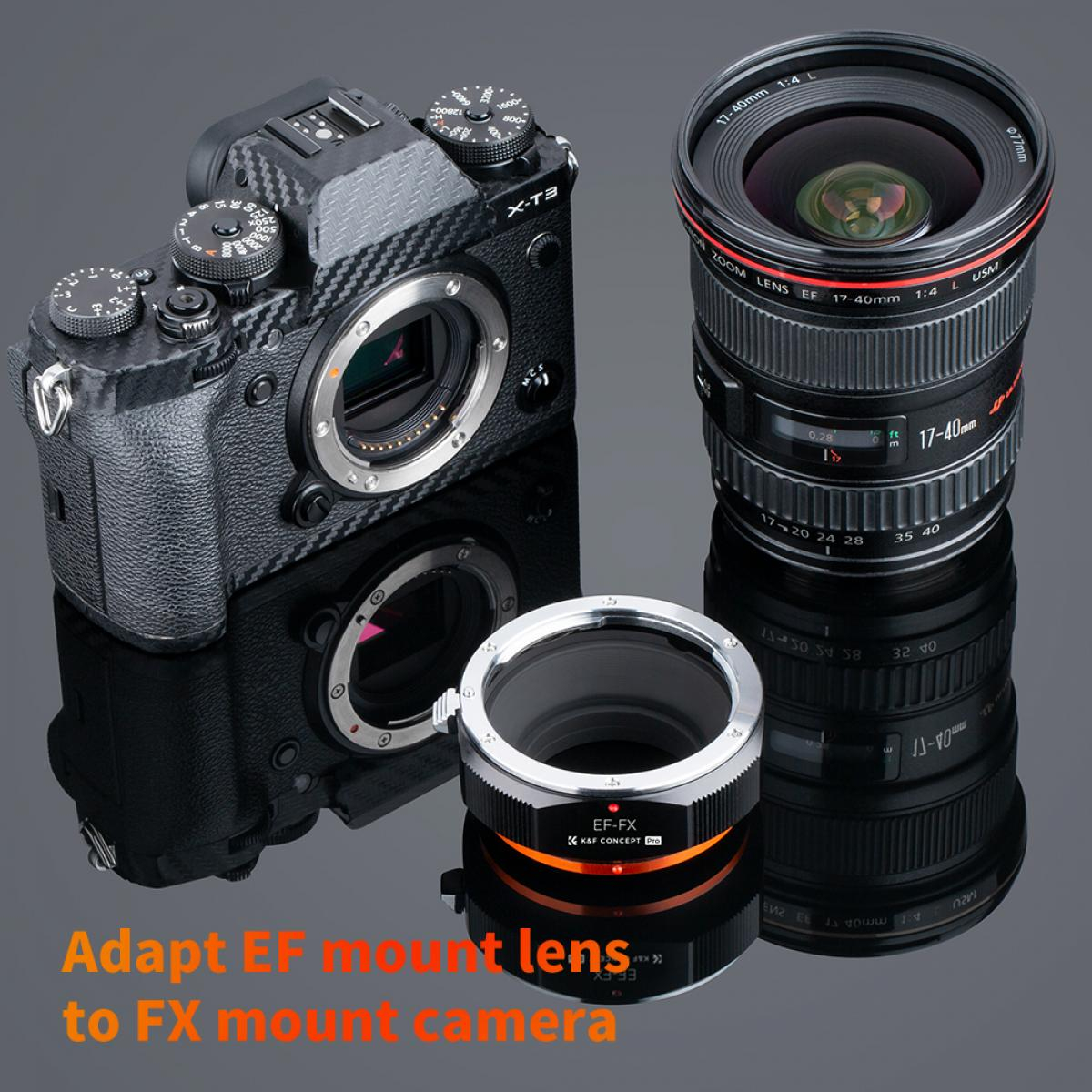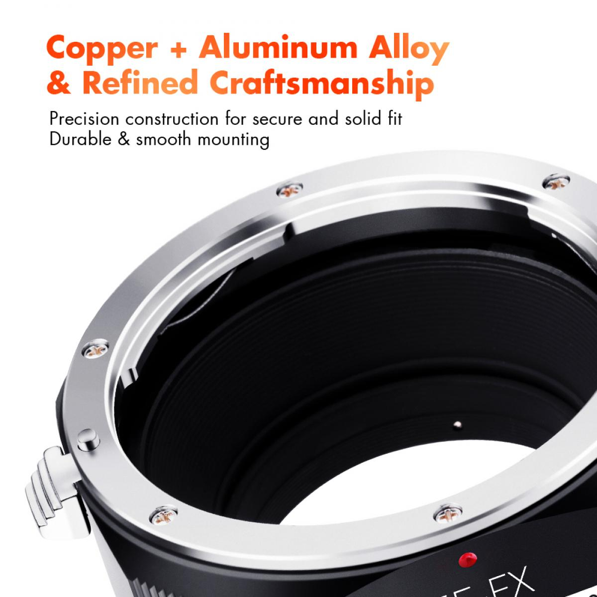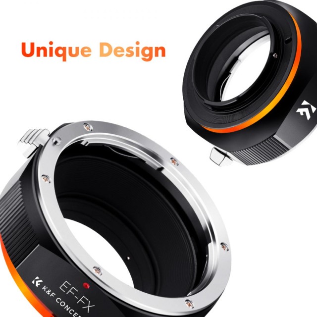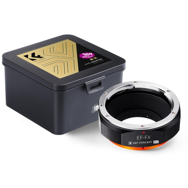 Adapter K&F Concept M12115 New Design High Precision Lens Mount omogoča uporabo Canonovih objektivov EF in EF-S na ohišjih brezzrcalnih fotoaparatov Fuji z nastavkom FX, kot so X-Pro1, X-T1 ali X-E2. Adapter je izdelan iz trpežne kovinske konstrukcije in zaključen s kaljenim anodiziranim premazom, zato je trpežen in odporen proti obrabi. Podpira ročno ostrenje, ročno upravljanje zaslonke in ostrenje do neskončnosti, kar fotografom omogoča popoln ustvarjalni nadzor. Notranjost z matiranim zaključkom pomaga zmanjšati notranje odseve, jasno označena rdeča poravnalna pika pa omogoča hitro in enostavno pritrditev objektiva.