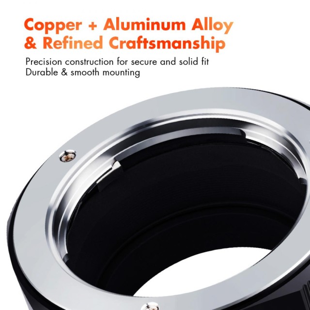 Visokoprecizni nastavek za objektiv K&F M15115 (MD-FX ) omogoča uporabo objektivov Minolta MD/MC Mount SLR na brezzrcalnih fotoaparatih Fujifilm serije X, kar zagotavlja brezhibno povezavo za fotografe, ki želijo uporabljati klasične objektive s sodobnimi fotoaparati. Ta povsem kovinski adapter je izdelan iz kaljenega anodiziranega aluminija, kar zagotavlja vzdržljivost in dolgotrajno delovanje. Notranjost je matirano lakirana, da se zmanjša odboj svetlobe in izboljša kakovost slike.