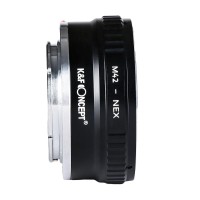 Adapter K&F M42 objektivov za fotoaparat Sony E Mount. Omogoča uporabo objektivov z bajonetom M42 na ohišju fotoaparata Sony E NEX/Alfa. Izdelan iz medenine in aluminija. Stabilna, natančna in vzdržljiva konstrukcija.Ročno upravljanje.Omogočeno neskončno ostrenje.