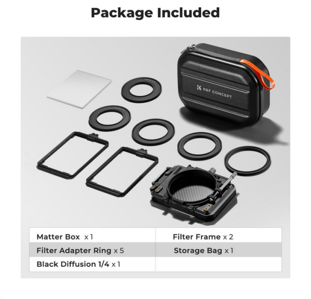 Komplet K&F Matte Box Kit vključuje 5 adapterskih obročkov (67/72/77/82/95 mm), kvadratni filter Black Mist 1/4 in dva okvirja za filtre 4x5,65". Ta lahka mat škatla iz ogljikovih vlaken je zasnovana za optimalno delovanje in vsestranskost ter zagotavlja celovito združljivost objektivov in visokokakovostno optiko za video in fotografijo profesionalnega razreda.