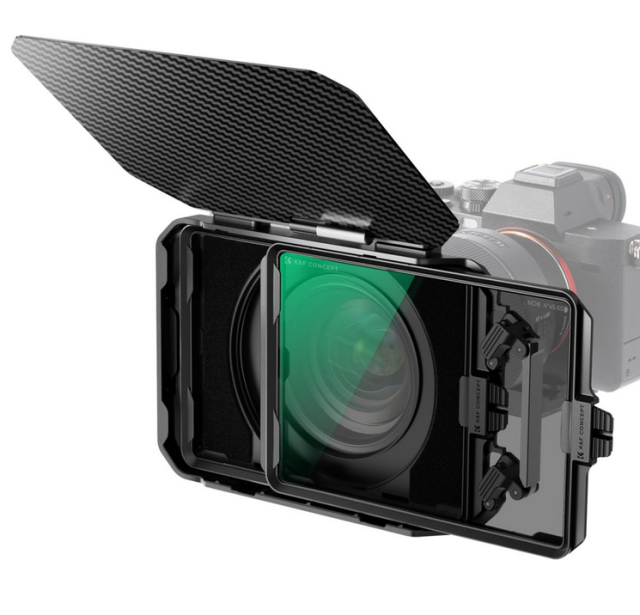 Komplet K&F Matte Box Kit je izdelan iz lahke ogljikove vlaknine in vsebuje 5 adapterjev, kvadratni filter ND8 ter dvojni filter 4x5,65". Zasnovan je za preprečevanje razpršene svetlobe in zagotavljanje visokokakovostnih slik, zato je idealen za profesionalno snemanje videov in fotografiranje v ločljivosti 4K/8K ter je popolnoma združljiv z DSLR in brezzrcalnimi fotoaparati.