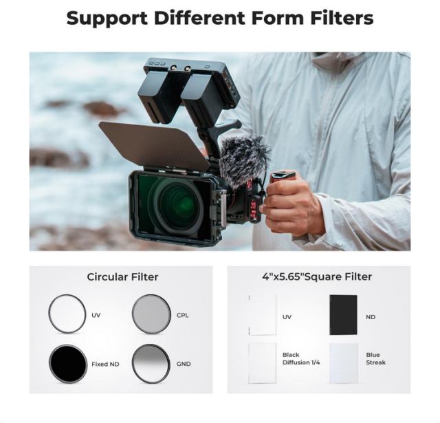 Vsestranski sistem filtrov: Matirana škatla sprejme dva filtra velikosti 4x5,65" (debeline 4 mm), ki sta varno pritrjena na svojem mestu. To zagotavlja fleksibilnost v različnih snemalnih okoljih, saj lahko po potrebi uporabite ND-filtre, polarizatorje ali difuzijske filtre.