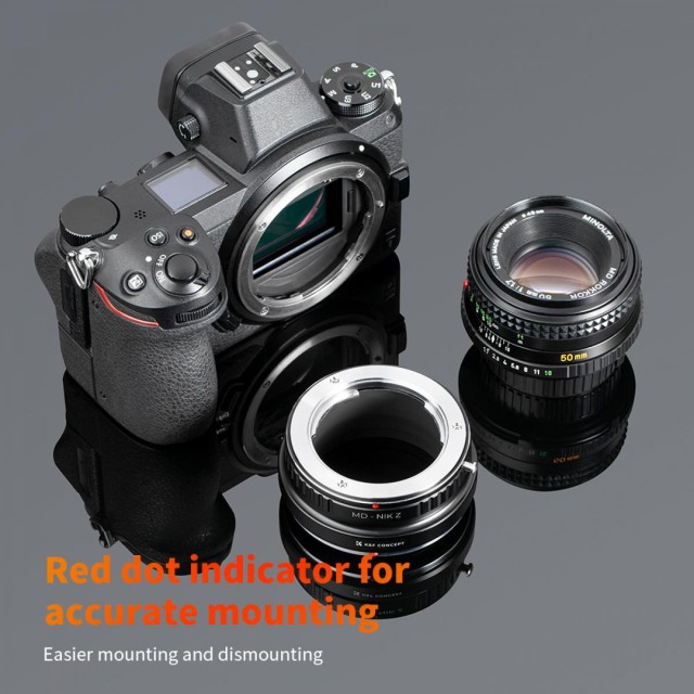 K&F Concept Minolta MD/MC do Nikon Z objektivni adapter omogoča uporabo klasičnih objektivov Minolta MD in MC na fotoaparatih Nikon Z-mount, kot sta Z6 in Z7. Izdelan je iz gladkega, trpežnega bakra, podpira popolnoma ročno ostrenje, ostrenje v neskončnost in ima rdečo piko za lažjo namestitev.
