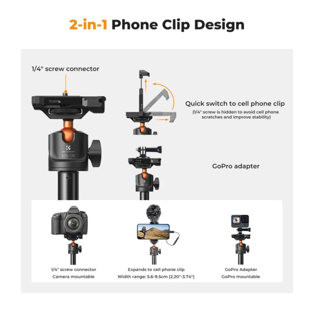 MS04 62''/1,58 m stativ za telefon in selfije, črn in oranžen z daljinskim upravljalnikom Bluetooth + adapterjem za GoPro. Največja višina doseže 157,8 cm, noge pa se lahko nastavijo v 7 položajih. Višino lahko nastavite po želji. Glava stativa nosi do 3 kg in je primerna za večino brezzrcalnih fotoaparatov, mobilnih telefonov in druge opreme.