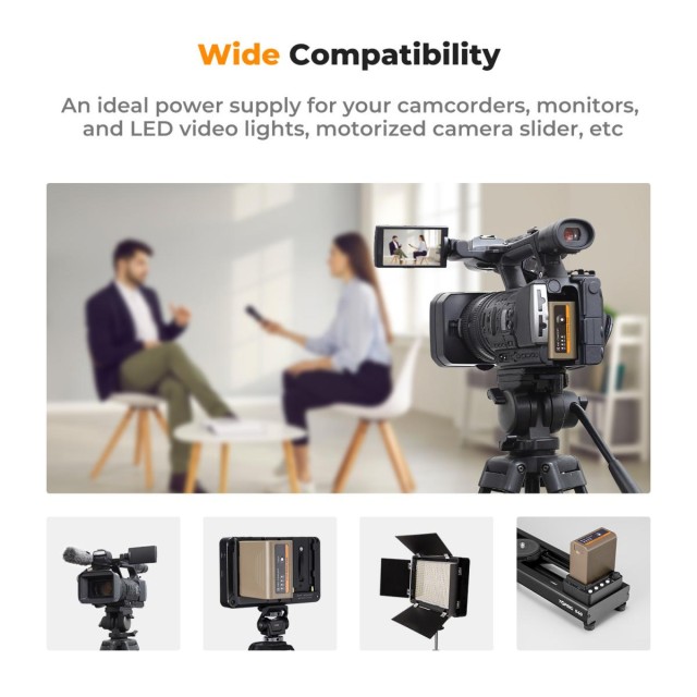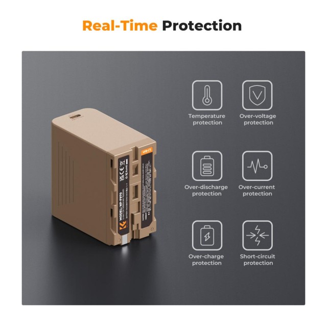 Ta baterija NP-F970 ima polnilni priključek USB tipa C za polnjenje z visokim tokom (PD3.0/20 W), ki za popolno napolnitev potrebuje le 4,8 ure, kar v primerjavi z običajnim polnjenjem skrajša čas polnjenja za 40 %. Stopnja napolnjenosti baterije je 25 %, 50 %, 75 % in 100 %. Preprosto pritisnite gumb "CHECK", da aktivirate indikatorje in preverite stanje baterije.
