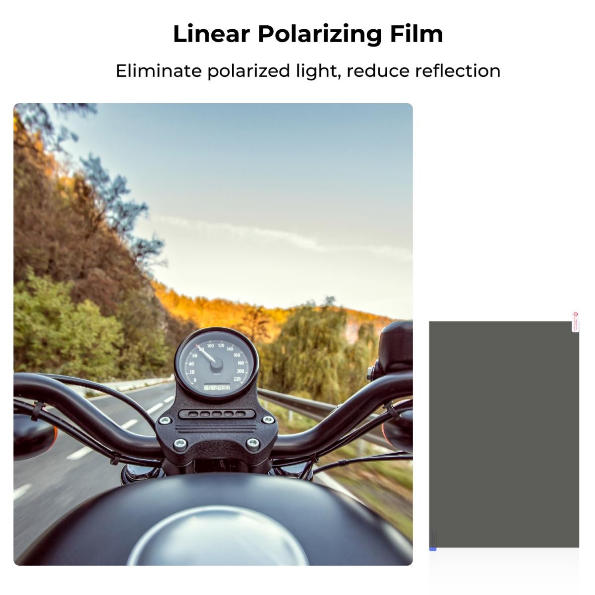 Film meri 20 × 30 cm in je tanek 0,21 mm, na obeh straneh pa ima zaščitne plasti – eno lepljivo in eno nelepilno – za čisto rokovanje in natančno namestitev. Jasne rdeče in modre oznake pomagajo prepoznati lepljivo (rdečo) in nelepilno (modro) stran, kar poenostavi namestitev. Priloženi strgalo, suha krpa in vlažna krpa z alkoholom zagotavljajo namestitev brez prahu in mehurčkov. Film zavrtite, da najdete optimalni polarizacijski kot, prerežite na želeno velikost in namestite za takojšnje rezultate.