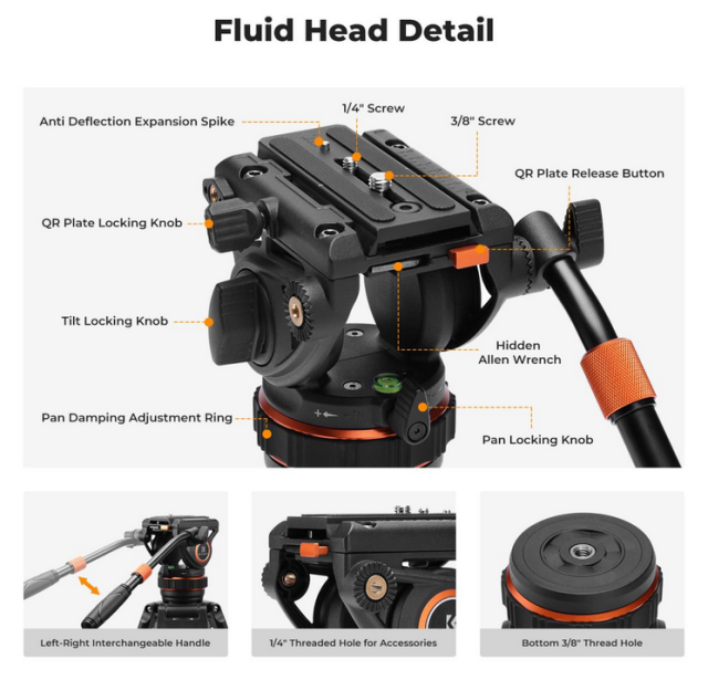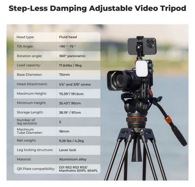 K&F Professional Video Tripod Head VA3+BV10 zagotavlja gladko in stabilno premikanje fotoaparata z naprednim hidravličnim blaženjem in natančnim nadzorom, kar je idealno za snemanje videoposnetkov in natančno kompozicijo.